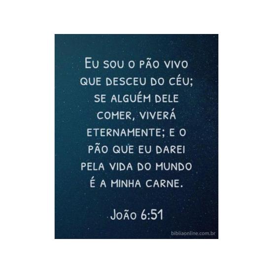Eu sou o Pão vivo que desceu do Céu; se alguém dEle comer, viverá eternamente; e o pão que Eu darei pela vida do mundo é a Minha carne. João 6:51.