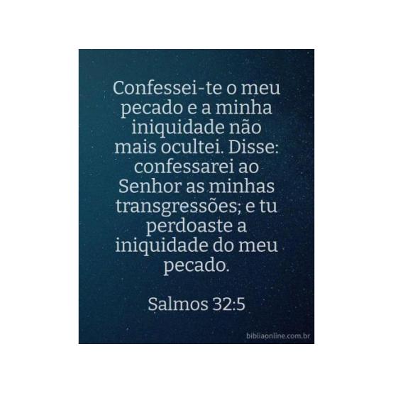 Confessei-Te o meu pecado e a minha iniqüidade não mais ocultei. Disse: Confessarei ao Senhor as minhas transgressões; e Tu perdoaste a iniqüidade do meu pecado. Salmos 32:5.