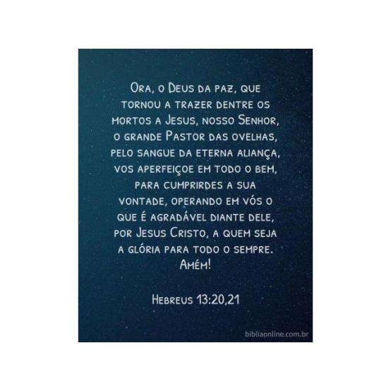 Ora, o Deus da paz, ... vos aperfeiçoe em todo bem, para cumprirdes a Sua vontade, operando em vós o que é agradável diante dEle, por Jesus Cristo, a quem seja a glória para todo o sempre. Amém. Hebreus 13:20, 21.