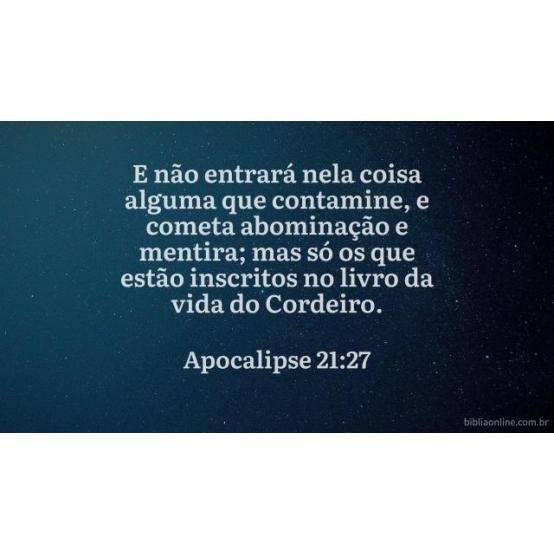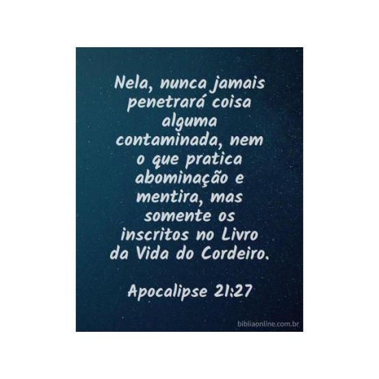 Nela, nunca jamais penetrará coisa alguma contaminada, nem o que pratica abominação e mentira, mas somente os inscritos no Livro da Vida do Cordeiro. Apocalipse 21:27.