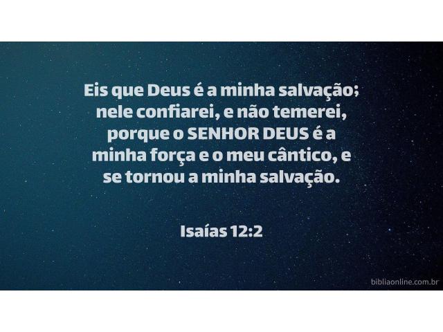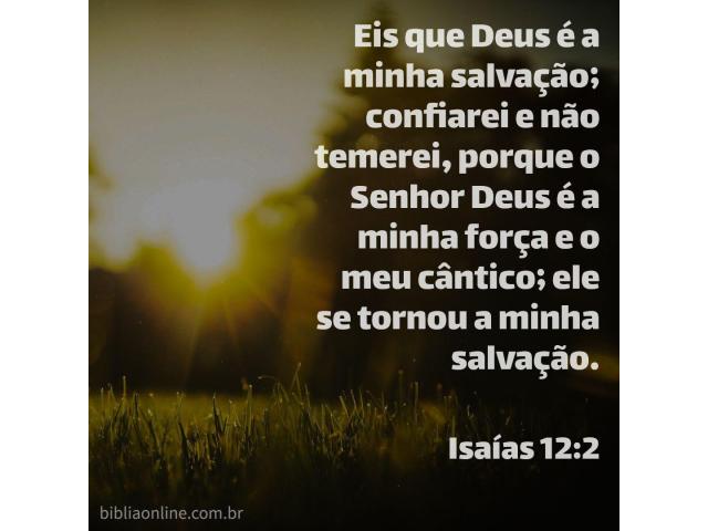 Eis que Deus é a minha salvação; confiarei e não temerei, porque o Senhor Deus é a minha força e o meu cântico; Ele Se tornou a minha salvação. Isaías 12:2.
