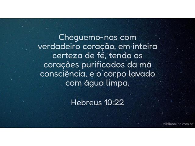 Aproximemo-nos, com sincero coração, em plena certeza de fé, tendo o coração purificado de má consciência e lavado o corpo com água pura. Hebreus 10:22.