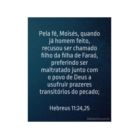 Pela fé, Moisés, quando já homem feito, recusou ser chamado filho da filha de Faraó, preferindo ser maltratado junto com o povo de Deus a usufruir prazeres transitórios do pecado. Hebreus 11:24, 25.