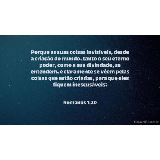 Porque os atributos invisíveis de Deus, assim o Seu eterno poder, como também a Sua própria divindade, claramente se reconhecem, desde o princípio do mundo, sendo percebidos por meio das coisas que foram criadas. Tais homens são, por isso, indesculpáveis. Romanos 1:20.