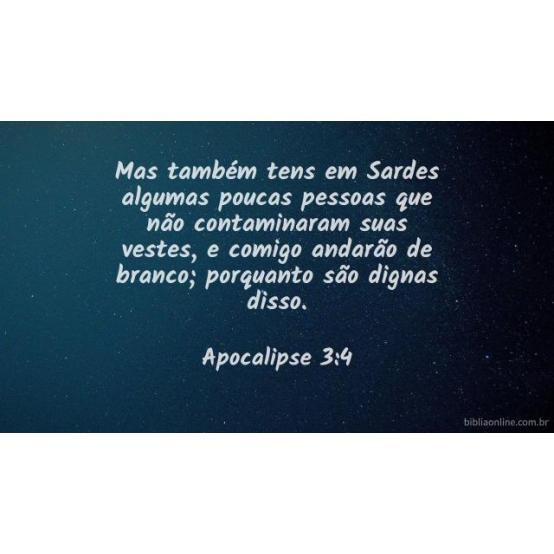 Tens, contudo, em Sardes, umas poucas pessoas que não contaminaram as suas vestiduras e andarão de branco junto comigo, pois são dignas. Apocalipse 3:4.